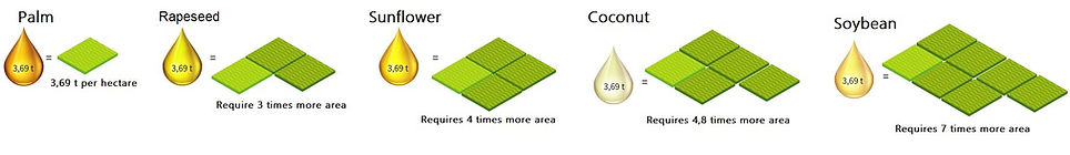 • ​ Palm oil is an efficient crop, producing more oil per land area than any other equivalent vegetable oil crop. Globally, palm oil supplies 35% of the world’s vegetable oil demand on just 10% of the land. To get the same amount of alternative oils like soya bean or coconut oil you would need anything between 4 and 10 times more land, which would just shift the problem to other parts of the world and threaten other habitats and species.